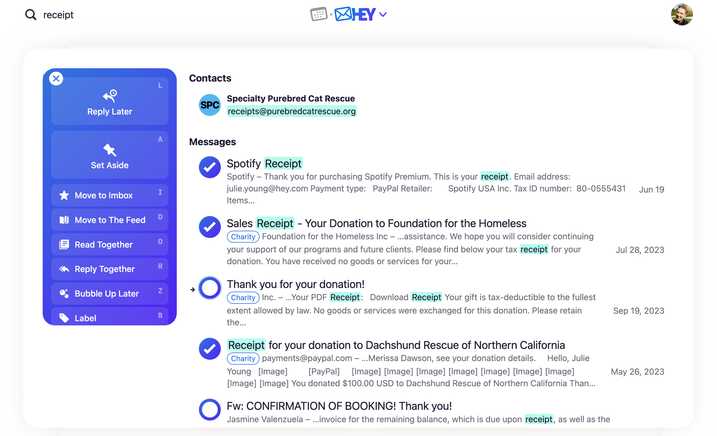 At last, you can select emails in the search results and take action on them. When you see a few threads that you want to label, add to a workflow, or read together, just click them and choose the action. The same options you have in the Imbox are available for search results.